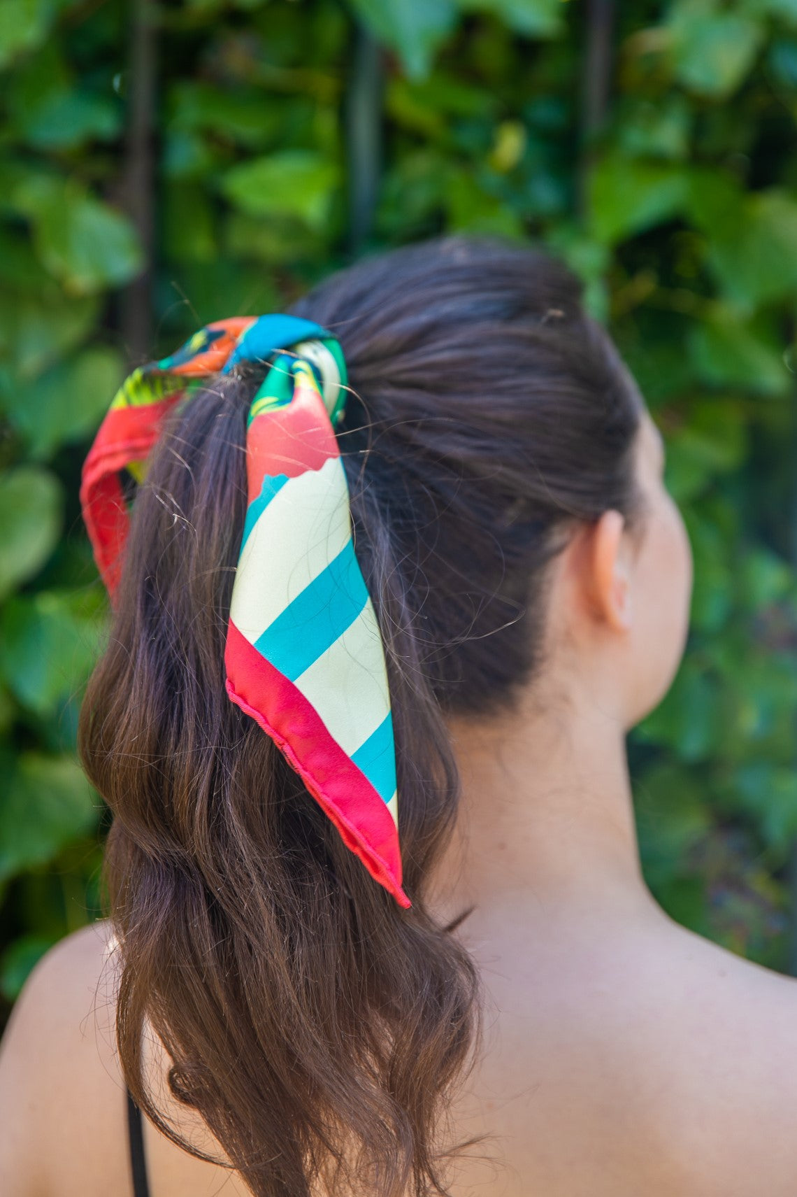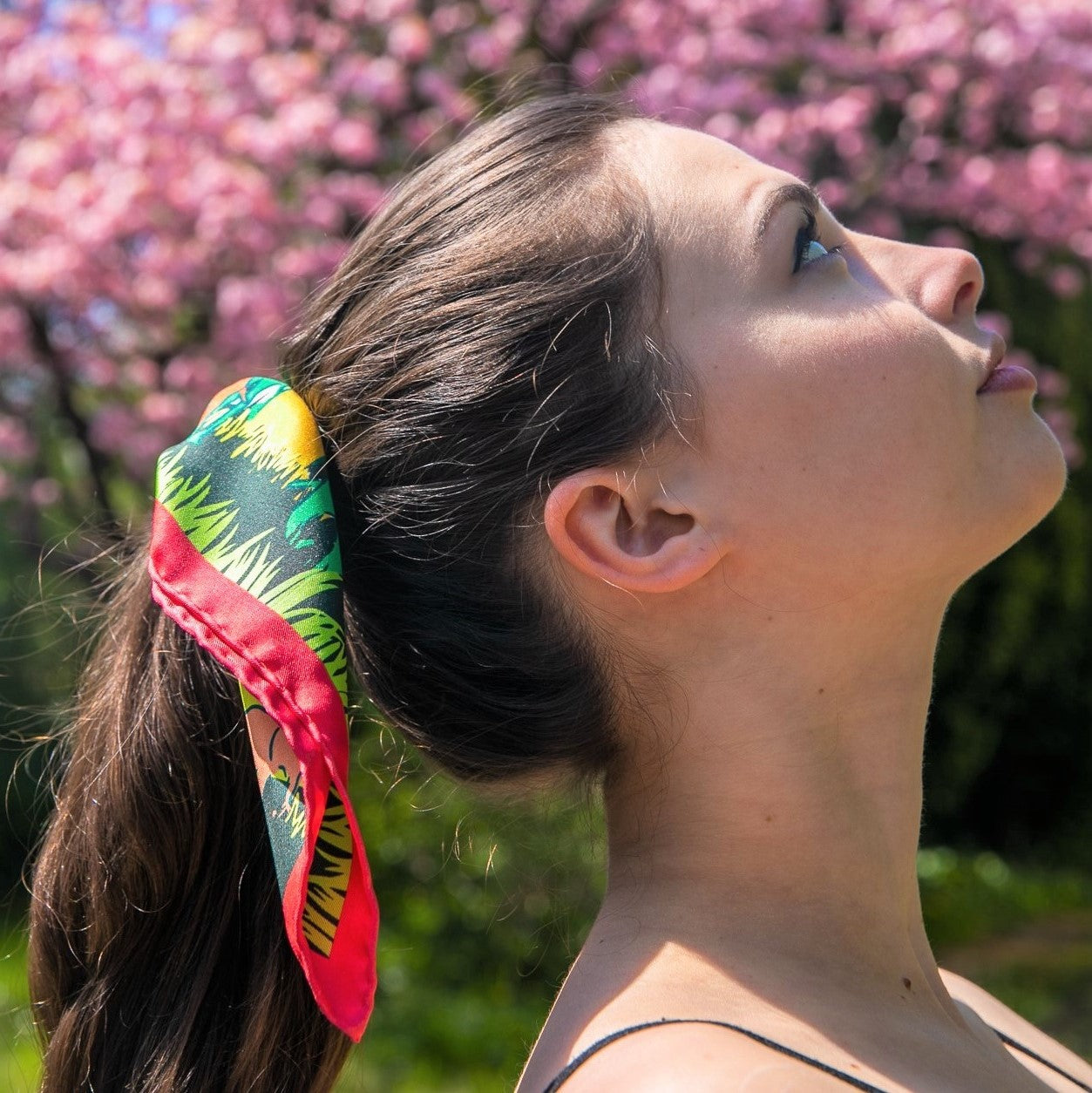 Cette pochette en soie représente un paysage imaginaire où se mêlent la faune et la flore; où coupé du monde vous faites face aux humbles forces de la nature et à la vie animale.